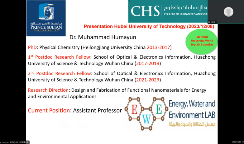 (理学院国际合作交流中心 报道)理学院芯片产业学院于2023年12月8日上午邀请苏丹王子大学Muhammad Humayun博士进行了以“Designing g-C3N4 based heterostructure photocatalysts for CO2 conversion and H2 production”为主题的学术报告。本次报告采取线上会议的方式进行。