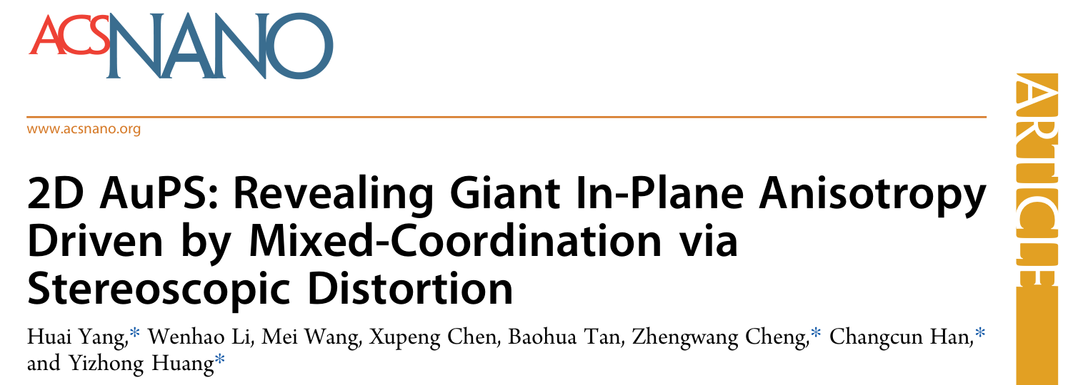 原文链接:Huai Yang*, Wenhao Li, Mei Wang, Xupeng Chen, Baohua Tan, Zhengwang Cheng*, Changcun Han* and Yizhong Huang*. 2D AuPS: Revealing Giant In-Plane Anisotropy Driven by Mixed-Coordination via Stereoscopic Distortion. ACS Nano, 2025, DOI: 10.1021/acsnano.5c13668