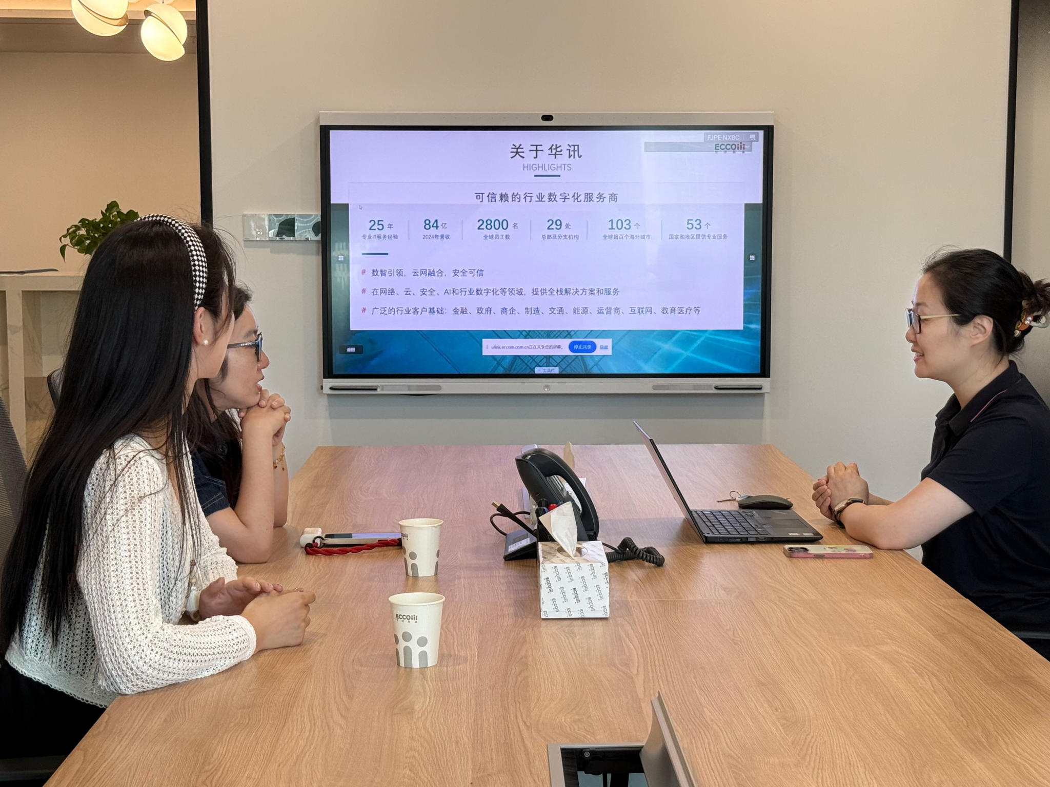 在座谈会上,陈彦君介绍了学院的办学特色及专业设置,围绕人才培养、校企合作模式及学生就业能力提升等方面进行了专题分享。华讯网络分享了其在融合系统等领域的创新成果及岗位需求,表示希望通过校企合作为企业注入新鲜血液。此次访企拓岗活动不仅为双方搭建了沟通桥梁,也为未来的长期合作奠定了基础。复星旅文集团详细介绍了企业的发展历程、业务布局及人才需求,重点强调了其对专业化人才的重视。