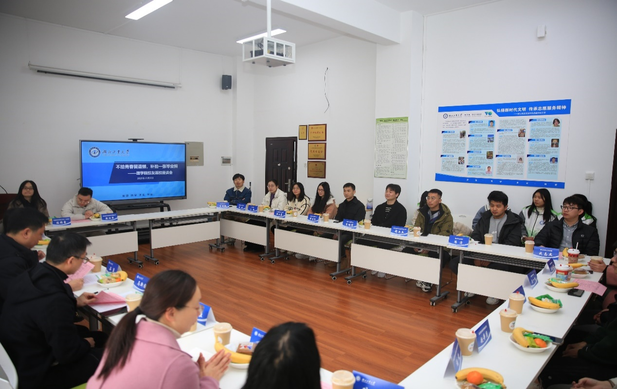 随后,校友们来到科技楼102与学院老师们座谈。理学院党委书记石勇、党委副书记陈彦君、副院长耿亮、马新国参会。会议还请来了校友们想念已久的辅导员、班导师和专业老师们。首先,马新国致欢迎辞,他介绍了学院近年的发展情况,感谢校友们对学院一直以来的大力支持。在师生自由交流环节,校友们表达了自己对学校和老师的感激之情,分享了毕业后的生活和感受,对理学院的发展提出了建议;老师们回忆了同学们在校的趣事轶事,鼓励大家要有自信。最后,石勇总结讲话,他肯定了校友们在各自岗位上做出的成绩以及表现出来的湖工大学子自信、奋进的精神状态,感谢校友为学院学校提出了中肯的意见和建议,期待更多的优秀校友回母校开展校企合作、给学弟学妹们传授经验。会议由陈彦君主持。