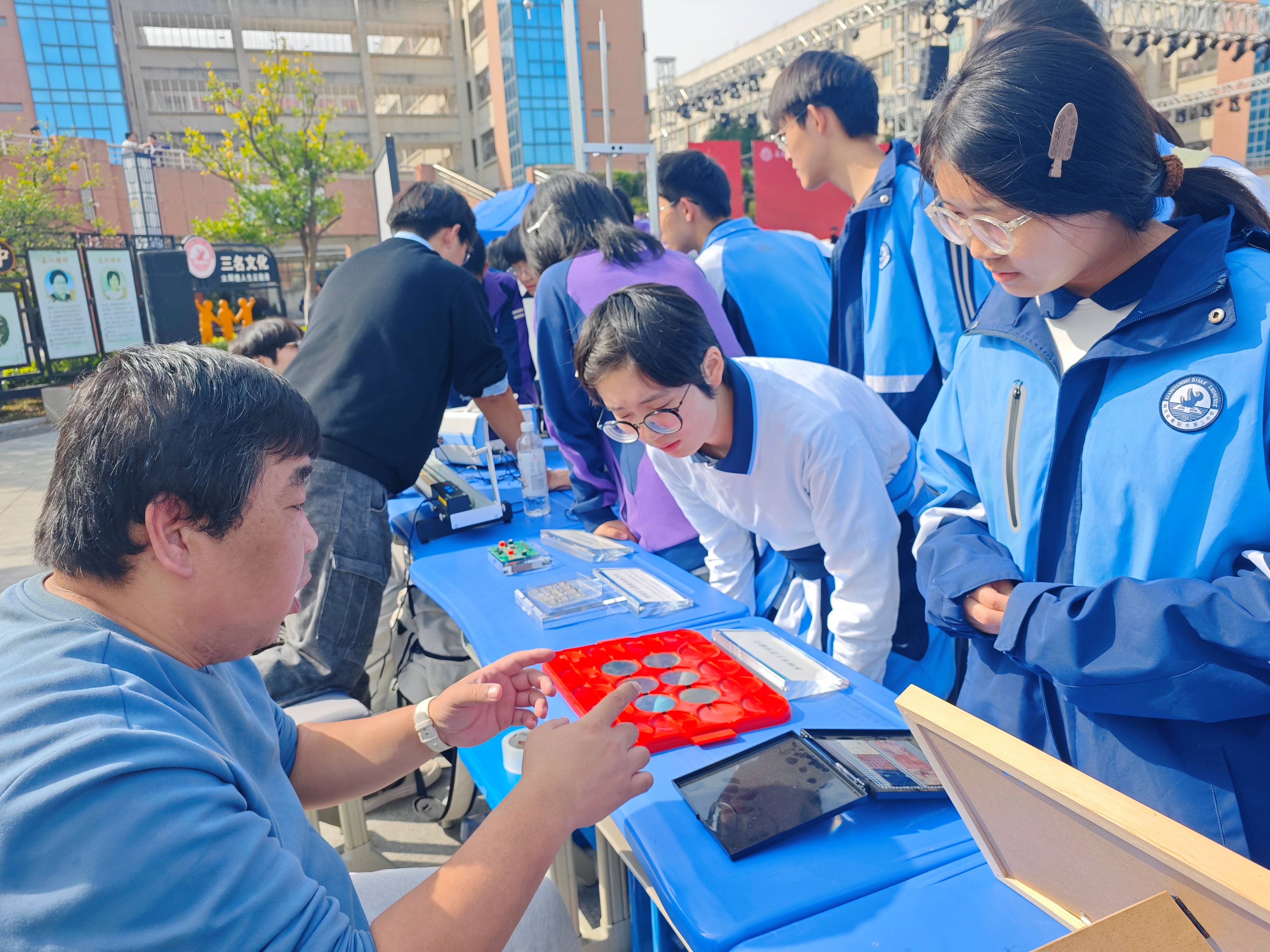 科技展区,物理实验互动与芯片知识讲解两大板块吸引大批师生驻足体验。“芯系家国,青创未来”实践队成员化身“科普讲师”,通过实物模型演示、流程示意图拆解,结合通俗讲解,将芯片从设计、制造到封装测试的全流程清晰呈现;在多普勒效应实验展区,团队通过移动声源设备与实时波形图同步演示,让原本抽象的物理原理瞬间“看得见、听得着”——当声源移动引发音调变化时,学生们争相上手操作,现场惊叹声与讨论声交织。“原来一颗小小的芯片,要经过这么多复杂工序才能诞生!”无论是芯片全流程的清晰呈现,还是多普勒效应的可感演示,都通过“动手+观察”的模式,实现了知识传递与科学兴趣激发的双重效果。